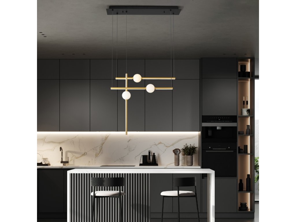Hagyja magát elragadtatni a Nova Luce márka Acrobat függőlámpájának exkluzív megjelenésével, amely kifinomult dizájnjávalelbűvöli Önt. A lakkozott fém aranyszínű színe luxusérzetet ad a lámpatestnek, az opálüveg pedig lágyítja a fény meleg tónusait. Tökéletes kontrasztot alkotnak a játékos elemek a szerkezet egyenes vonalvezetésű, kerek árnyalatokkal ellátott egyenes vonalai. Hagyja, hogy a fény szó szerint beragyogja a konyhaszigetet vagy az étkezőasztalt, és adjon egy kis eleganciát a belső térnek!