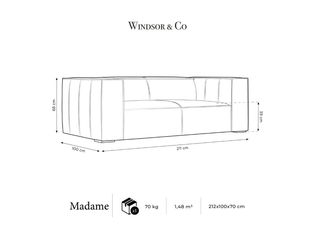 A Madame kétüléses kanapé a Windsor & Co-tól egy feltűnő bútordarab, amely ötvözi az egyszerűséget és az eleganciát. A barna színárnyalatú valódi bőrkárpitozással megnyeri magának e fényűző anyag kedvelőit. A felhasznált marhabőr felső rétege finoman dombornyomott, ami megőrzi a finom szerkezetét, és láthatóvá teszi a felületén a természetes tulajdonságait. A Madame kanapé arányainak köszönhetően nemcsak tágas és kényelmes helyet kínál, de Ön is szeretni fogja tiszta vonalvezetését és időtlen megjelenését. Remekül mutat vintage és ipari belső terekben. A Madame sorozat többféle kivitelben lábzsámolyokat vagy karosszékeket is kínál, amelyekkel tökéletesen összehangolhatja belső terét . Pihenjen stílusosan!
