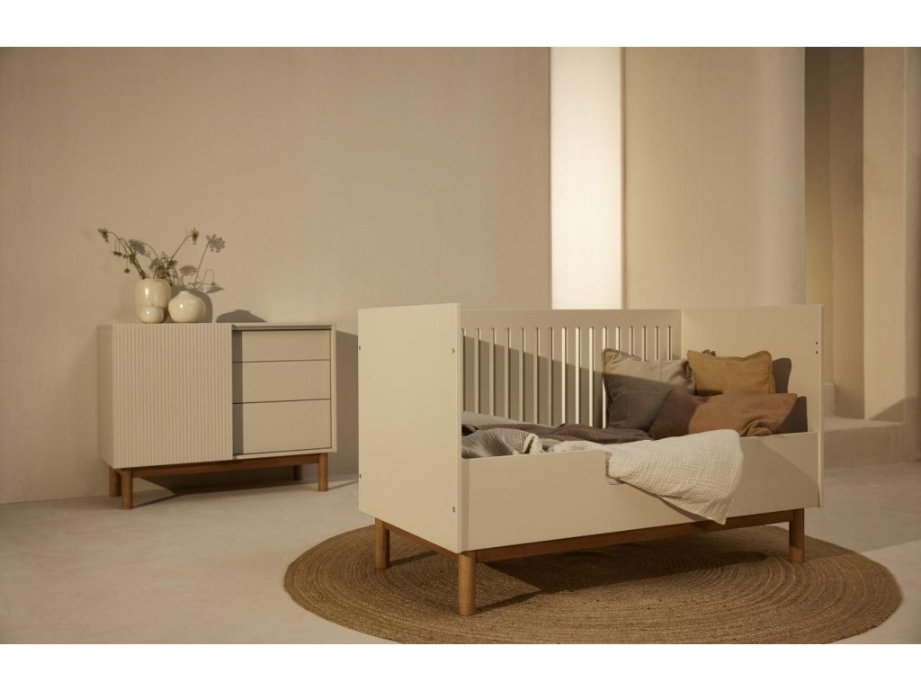A modern kiságy Quax Mood a gyerekszoba szerves része. A természetes bükk alap és a bézs színű lakkozott fa elegáns és minimalista kombináció, amely finom, légies benyomást kelt . A kiságy három magassági szinten állítható, így a kiságyat az Ön igényeihez és a baba életkorához igazíthatja. Nagy előnye, hogy a kiságy elülső oldala eltávolítható, így a nagyobb gyermekek számára egy olyan kényelmes helyet hozhat létre, ahová segítség nélkül is könnyen elférnek. A kifinomult belső tér érdekében javasoljuk, hogy kombinálja a Quax Mood sorozat más elemeivel.