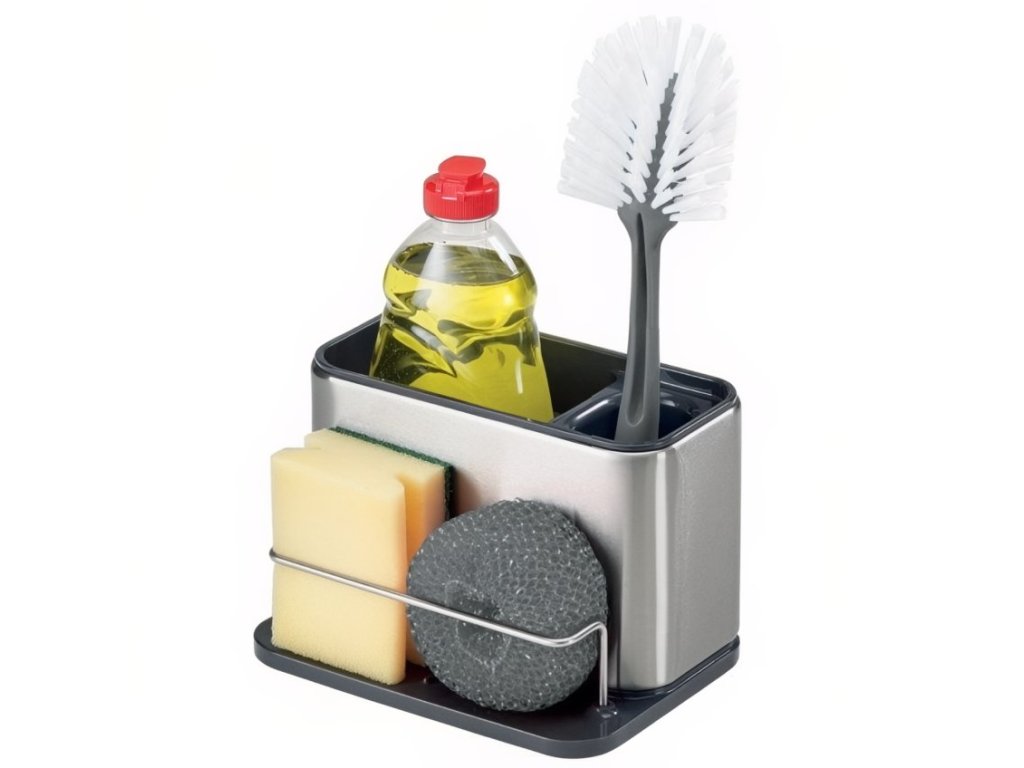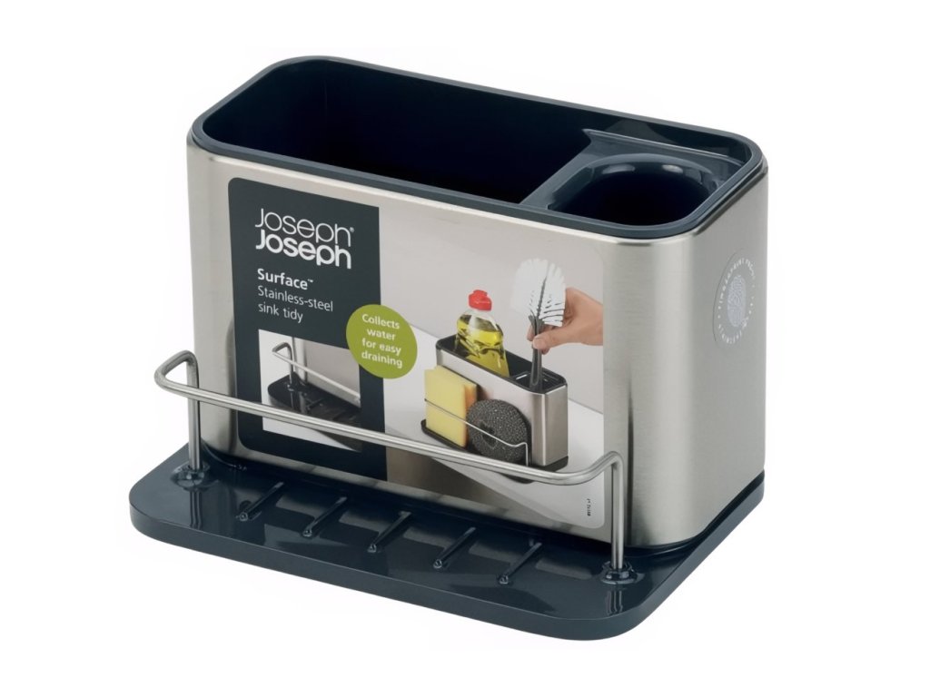 A praktikus rozsdamentes acél Surface Sink Tidy állvány a(z) Joseph Joseph terméktől konyhai tisztítószerekhez és szerszámokhoz készült. Külön szekciót talál a mosószer és a kefe számára. A külső tartó nedves szivacsok és drót szárítására szolgál. Az aljzaton tál és lefolyó található a víz könnyű kiöntése érdekében. Az állvány a könnyű tisztítás érdekében levehető. Csúszásmentes lábakkal és ujjlenyomat-álló matt rozsdamentes acél felülettel rendelkezik.