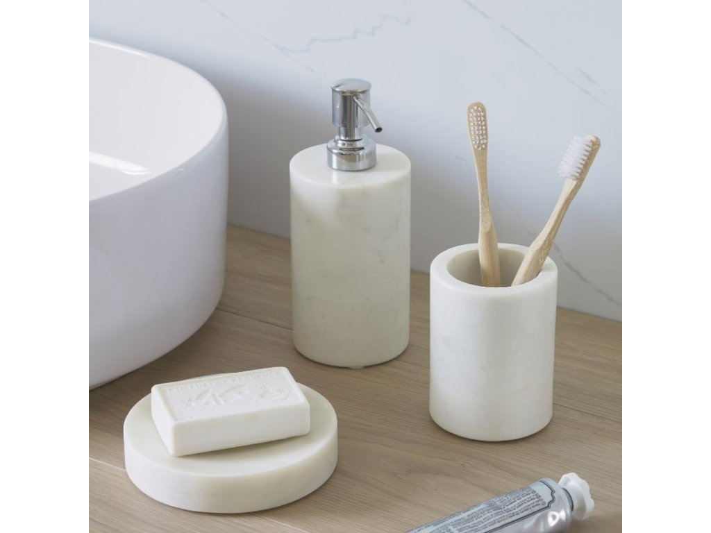 Elegáns szappanadagoló Kave Home Elenei a következő anyagból készült fehér márványból, amely fényűző benyomást kelt, és a fényes rozsdamentes acélból készült szivattyúval kombinálva minden modern fürdőszoba jellegzetes dísze lesz. Ajánlott az elegáns márvány kollekció többi darabjával kombinálni Kave Home Elenei.