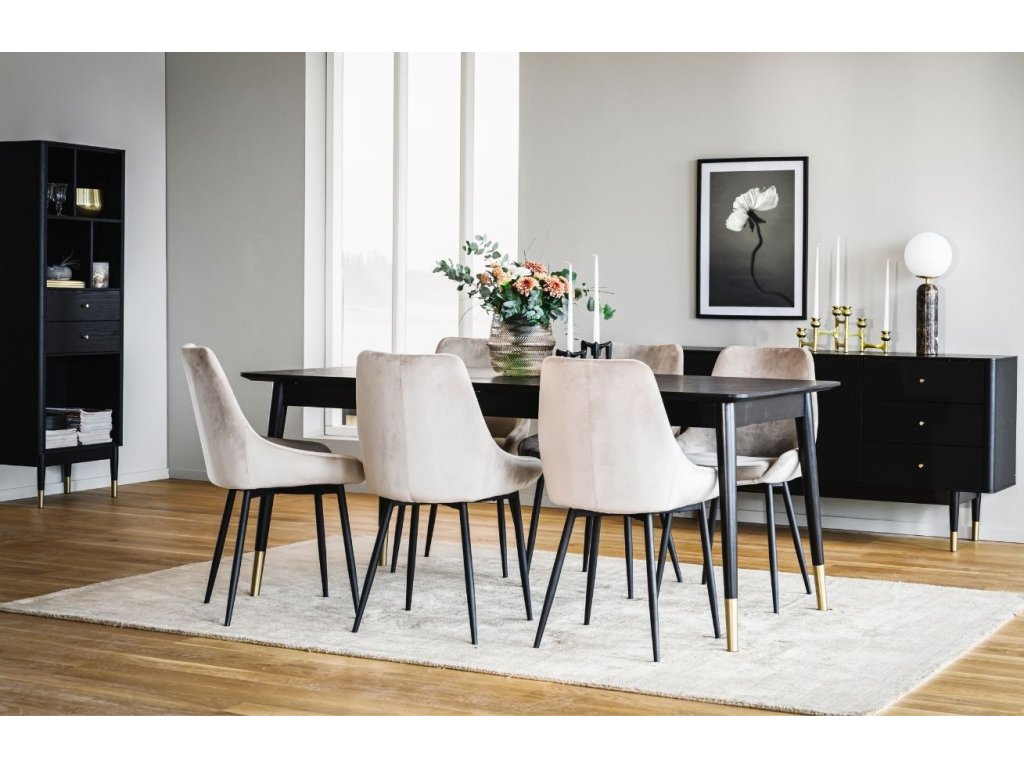 Az elegáns FENWOOD étkezőasztalt aranyszínű fém részletek hangsúlyozzák a talapzat alsó részén. Bármikor könnyedén két különböző hosszúságúra hosszabbítható, és 40 vagy 80 cm-rel meghosszabbítható. A kihajtható funkciónak köszönhetően akár 12 személyt is vendégül láthat az étkezőben. Az asztallap fekete kőrisfurnérból készült, és egy fekete lakkozott tömör gumifa talapzaton áll. Az asztalt kiegészítheti az ugyanabból a sorozatból származó tágas komóddal.