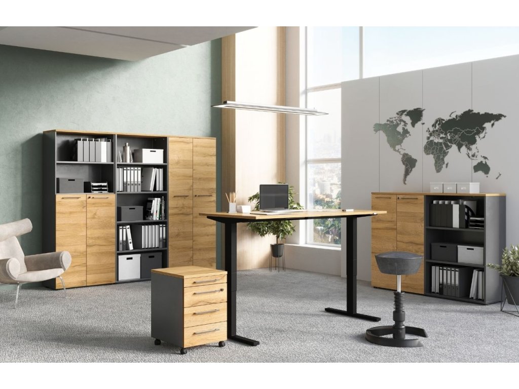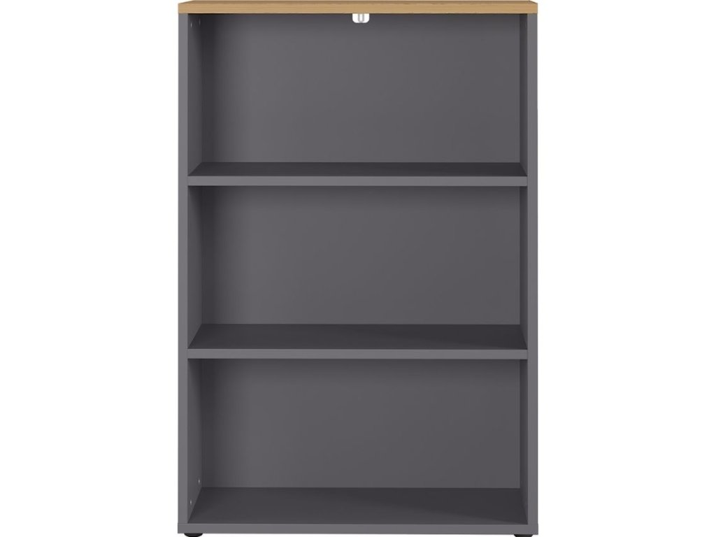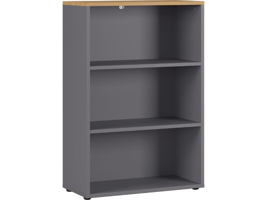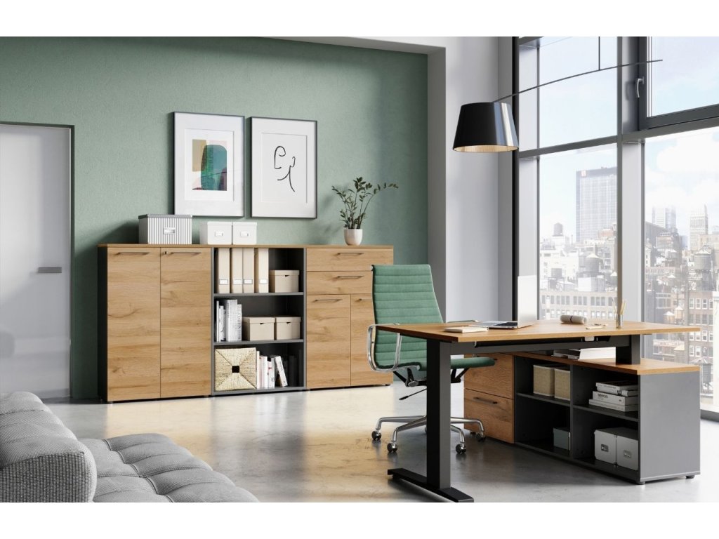 A modern Agenda irodai polc a GERMANIA márkától tökéletes darab az irodájába. A matt, grafit szürke laminált korpusz és a tölgyfa dekor a felső lapon kombinációja finom és letisztult megjelenést kölcsönöz, amely a minimalista design hangulatát viszi be a belső térbe. A tágas tárolóhelyet 3 nyitott polc biztosítja, aminek köszönhetően kényelmesen tárolhatja az összes felszerelését. OA nyitott polcok gyors hozzáférést biztosítanak a gyakran használt tárgyakhoz. A melamingyanta korpuszfelület ütésálló és nedvességálló felületet biztosít. Az ütésálló ABS éleknek köszönhetően nagyobb a tartósság, így nemcsak kereskedelmi helyiségekbe, hanem otthoni dolgozószobákba is kiválóan alkalmas. Praktikus könyvespolcként is örömet okozhat a modern lakótérben. Javasoljuk az Agenda termékcsalád összes termékének kombinálását.