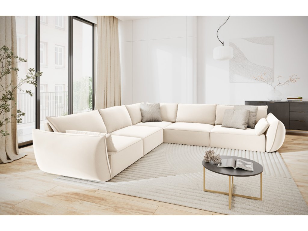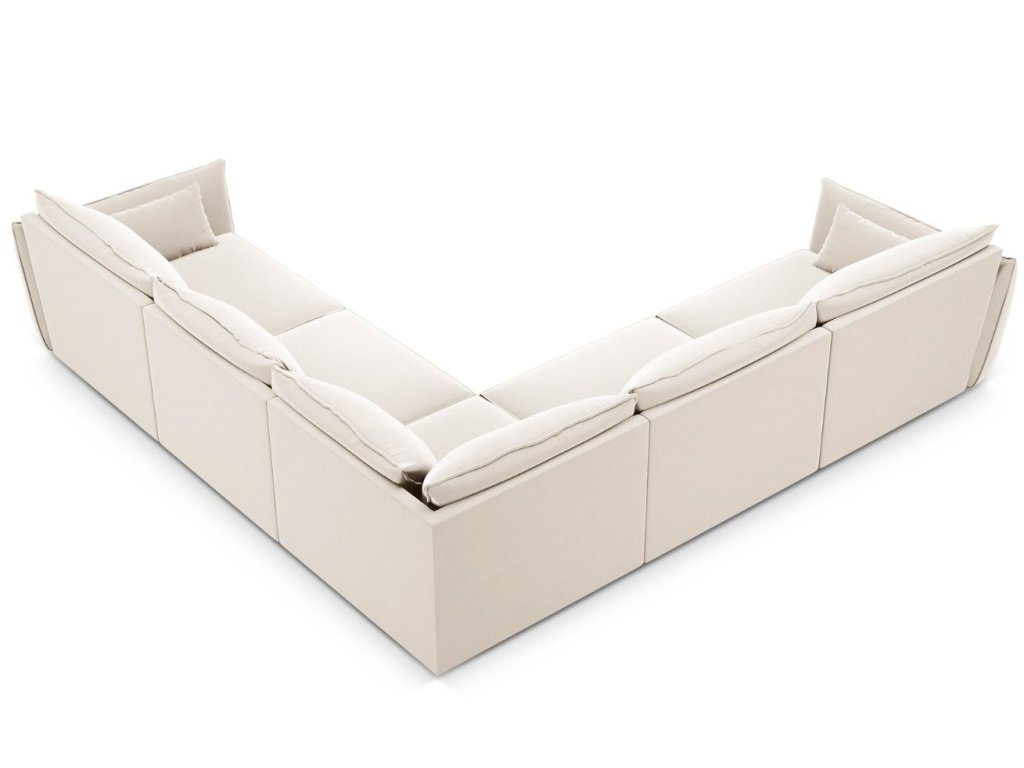 A Kaelle hétszemélyes sarokgarnitúra a Micadoni márkától elegáns, alacsony ülőfelületével és formatervezett karfáival nyűgöz le, amelyek egyedi megjelenést kölcsönöznek neki. A karfák és háttámlák körüli kidolgozott szegélyekkel ellátott téglalap alakú sziluett a párnák formáit idézi, amelyek kényelmet biztosítanak, és ideális kiegészítőjévé teszik a kanapét a modern nappalinak. Az ülőgarnitúrához kis párnák tartoznak, amelyek stílust és kényelmet kölcsönöznek. A teljes felületet bársonyos szövet borítja, ami tiszta és luxus hatást kelt. Ez a modell ráadásul könnyen kombinálható a kollekció többi bútorával, amely zsenília és bársony kivitelben is elérhető.