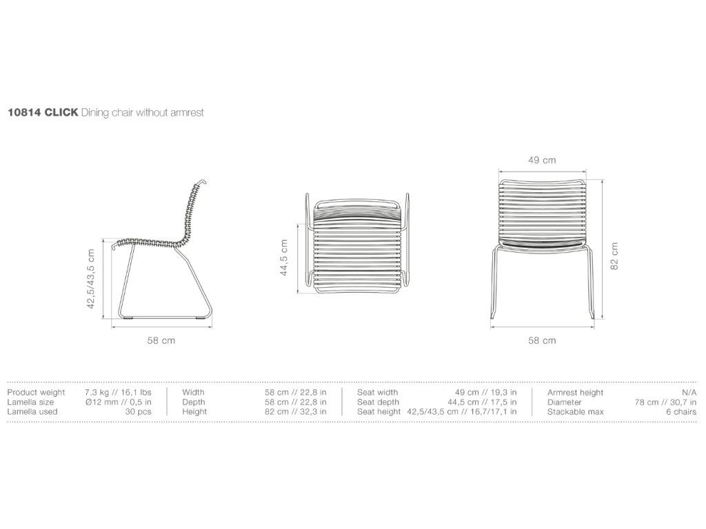 A HOUE Click kerti szék modern megjelenésével nyűgöz le. A Click szék a modern északi stílust hangsúlyozza, ami már első pillantásra magával ragadóvá teszi. A műanyag lécekből készült kényelmes ülőfelület és a fém talapzat együttesen egy egyedi bútordarabot alkotnak, amely tetszeni fog Önnek. A modern design és a markáns kifejezésmód kiemeli a szék általános lényegét. A szék alkalmas kültéri környezetbe.