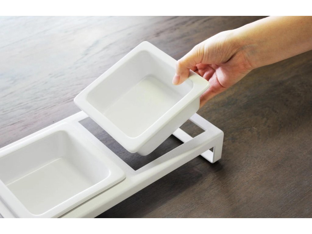 Még a háziállatoknak szánt tálaknak is lehet stílusa! Szerezze be a Yamazaki toronykészletét egy praktikus fémállvánnyal. Két kerámia tálat talál, amelyekben vizet és pelletet is tárolhat. A tálaknak az állvány segítségével történő megemelésének köszönhetően az evés kényelmesebb lesz kedvence számára, és nem fog csak úgy kiszívni valamit a tálakból. Könnyen eltávolíthatóak az állványról, így a karbantartás gyors és egyszerű. Tedd boldoggá szőrös barátodat ! Két változat közül választhat - a tálak fehér és fekete színben kaphatók.
