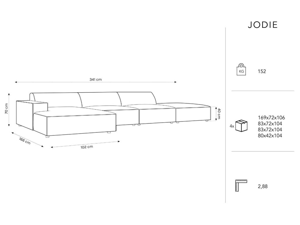 A tágas Jodie moduláris sarokkanapé a Micadoni weboldalról gyönyörű sziluettjével nyűgöz le. A kárpitozás bársonyt imitáló, finom fényű szövetből készült. A szövetet jó kopásállóság jellemzi, ami jelentősen csökkenti a sérülés kockázatát, és a cigarettatesztet is kiállta, így a kanapé alkalmas kereskedelmi helyiségekbe is. Párnázott formája garantálja a teljes pihenést, a mély ülés pedig tökéletes kikapcsolódást tesz lehetővé. A kontúros háttámlára és a széles kartámaszokra is támaszkodhat, amelyek a fesztelen lazításra ösztönöznek. Az alacsony talapzat illeszkedik a bútor hangulatos sziluettjéhez. A modulok nagy választéka lehetővé teszi, hogy olyan kombinációkat hozzon létre, amelyek a legjobban illeszkednek minimalista vagy skandináv stílusú nappalijához.