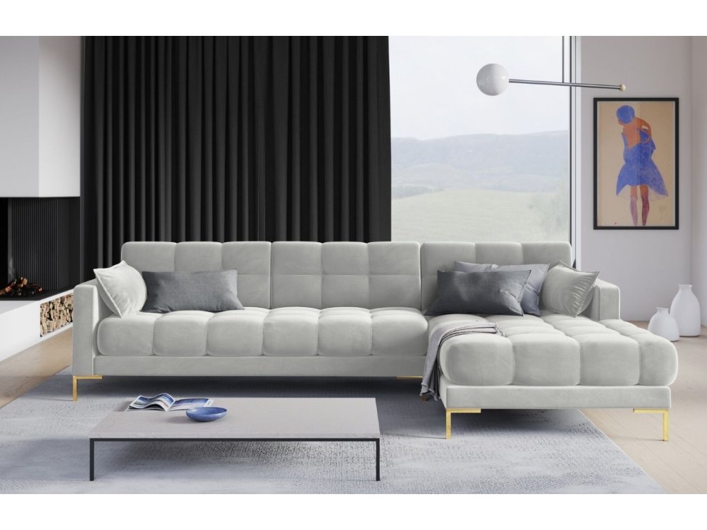 MICADONI MAMAIA világosszürke bársony sarokkanapé 293 cm arany alappal, jobb