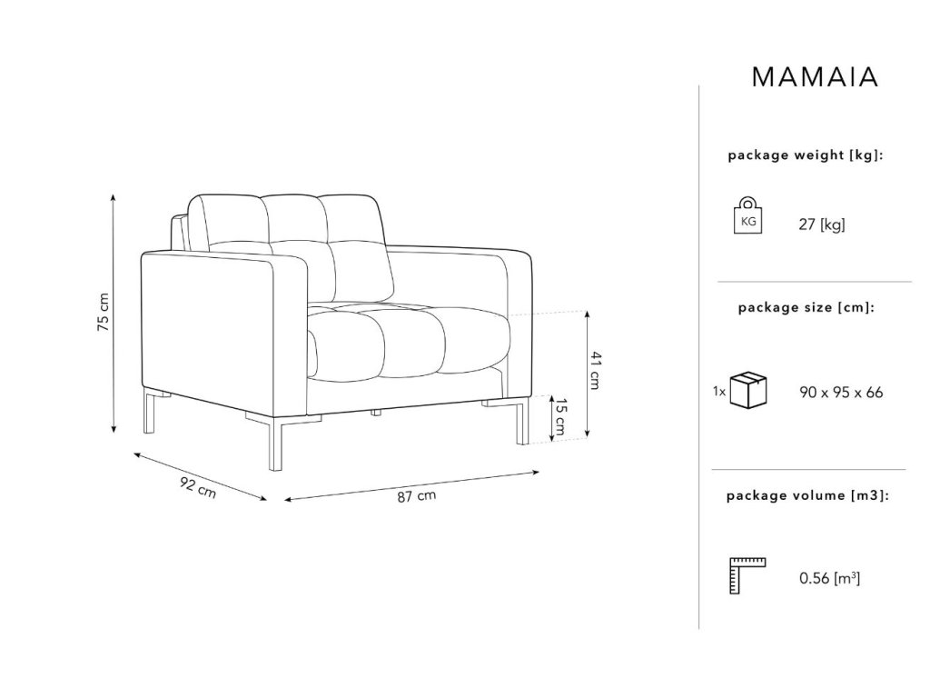 Szeretné szépen berendezni otthonát? A Mamaia fotel ideális választás. Ez a bútordarab egyszerű, de ízléses formával rendelkezik. A kárpitozás bársonyt imitáló, finom fényű szövetből készült, amely nagyon puha és selymes tapintású. Ezenkívül jó kopásállóság jellemzi, ami alkalmassá teszi kereskedelmi helyiségekbe való felhasználásra. Esztétikai tulajdonságai mellett a szék rendkívül kényelmes és ergonomikus is. Az egészet elegáns gombok egészítik ki a háttámlán, amelyek kifinomult és elegáns befejezést adnak a széknek. Az ülőfelületet fekete lakkozott fém talapzat emeli ki. A Mamaia többféle színben kapható. Válassza ki a megfelelőt a belső térhez!