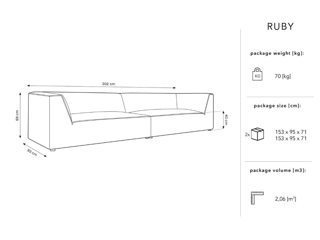 Ruby négyszemélyes kanapé a Ruby-tól Micadoni kellemes kiegészítője lesz nappalijának vagy társalgójának. A kellemes, enyhén csillogó bársony kárpit olyan védelmet tartalmaz, amely lassítja a folyadékok felszívódását - a folyadék az anyag felületén gyűlik össze anélkül, hogy mélyen behatolna a szálakba. Ez megkönnyíti a kiömlött kávé vagy tea másodpercek alatt történő eltávolítását egy nedvszívó ruhával vagy papírtörlővel. Ezenkívül a szövet átment a cigarettateszten, ahol a kárpitok füst- és gyulladásállóak. A különböző modulok és kanapéméretek kombinálásával különböző ülőhely-konfigurációkat hozhat létre, és olyan kényelmes ülőhelyet kaphat, amilyet csak szeretne. Javasoljuk, hogy a Ruby kanapét párosítsa egy egyszerű dohányzóasztallal, amelyre gyertyákat, dekorációkat vagy harapnivalókat helyezhet el, hogy egyszerű, mégis kifinomult skandináv nappali garnitúrát hozzon létre.