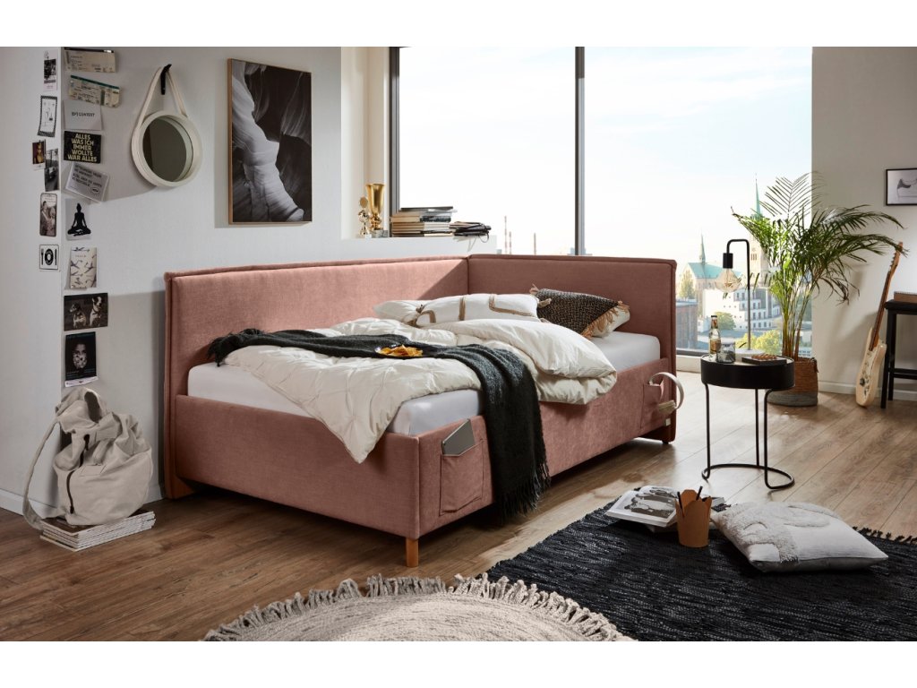 Rózsaszín kárpitozott ágy Meise Möbel Fun II. 140 x 200 cm ágyneműtartóval
