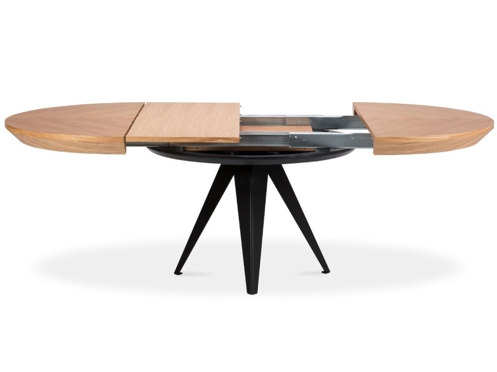 A Windsor & Co Magnus kerek kanapé étkezőasztal egyedülállóan elegáns kialakításával kápráztat el. Tökéletesen illeszkedik a stílusosan berendezett modern terekbe. A természetes tölgyfafurnérral borított asztallapot egy tömör, fekete lakkozott fém talapzat egészíti ki. Az asztal 230 centiméter szélességűre széthajtható. Akár 8 vendég is kényelmesen elfér benne. Tulajdonságainak köszönhetően a termék kereskedelmi helyiségekben, például éttermekben és szállodákban is használható.