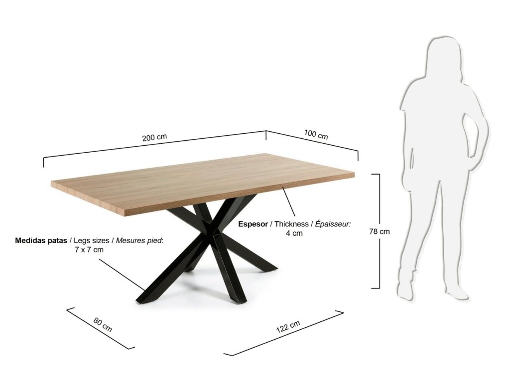 A gyönyörű és időtálló Kave Home Argo étkezőasztal első látásra lenyűgözi Önt eredeti és kifinomult kialakításával. Fekete lakkozott acél talapzata érdekes, csillagszerű formájú . Tökéletes stabilitást biztosít, és első pillantásra mindenkinek szemet szúr. A lap természetes színű laminált anyagból készült, és tökéletesen kiegészíti az alapot. Ez az étkezőasztal különösen jól mutat a modern belső terekben.