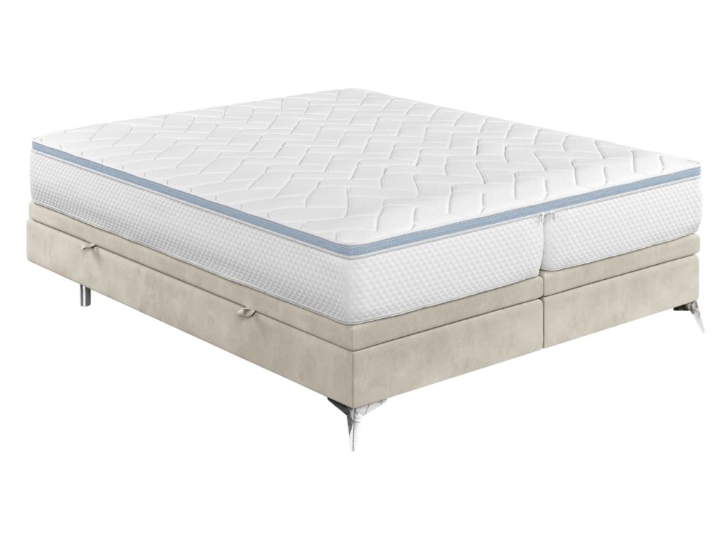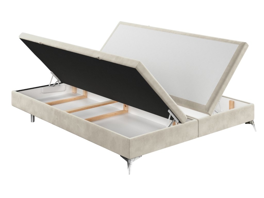 A FIR kétszemélyes ágy minimalista dizájnt és funkcionalitást hoz a hálószobájába. A finom, enyhén fényes bársonyos szövet és a Cleanaboo bevonat minimalizálja a folyadékok felszívódását, ami megkönnyíti a karbantartását. A praktikus, oldalról nyitható tárolódobozok elegendő helyet biztosítanak az ágynemű vagy a szezonális holmik tárolására.Az alap csúszásgátló rétege biztosítja, hogy a matrac mindig a helyén maradjon.Az ágy króm lábazata egy csipetnyi modern eleganciát kölcsönöz a teljes megjelenésnek. A FIR nagyszerű választás azok számára, akik szeretik a tiszta vonalakat és a praktikus stílust, amely segít otthonosabbá tenni otthonát.