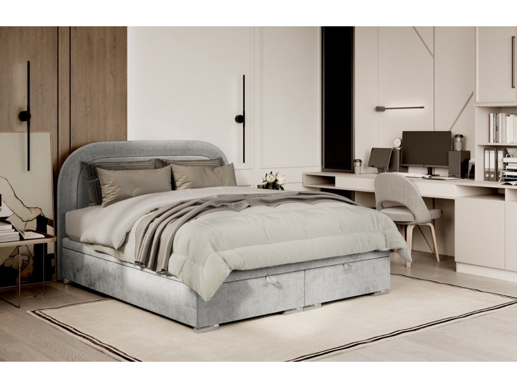 Az UFFIZI ágy eleganciát és kényelmet hoz hálószobájába egyben. A lekerekített, finom steppeléssel ellátott fejtámlának köszönhetően lágy hatást kelt, és kellemesen hangulatos légkört teremt. A praktikus, elöl nyíló tárolóhely ágyneműt vagy szezonális textíliákat tartalmaz, ami tisztaságot és rendet biztosít.A finom fényű és 3D hatású zsínelyszövet luxus megjelenést kölcsönöz az ágynak, ráadásul nagyon tartós. Az alap csúszásgátló felülete biztosítja, hogy a matrac mindig a helyén maradjon, és kényelmes és zavartalan alvást biztosít.